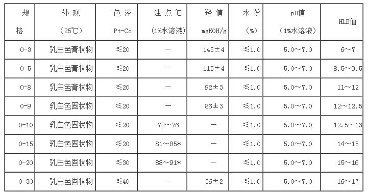2、O-8、O-9、O-10、O-15、O-20、O-30易溶于水及有機溶劑,對酸、堿、硬水穩(wěn)定。具有良好的潤濕、乳化、凈洗性能。